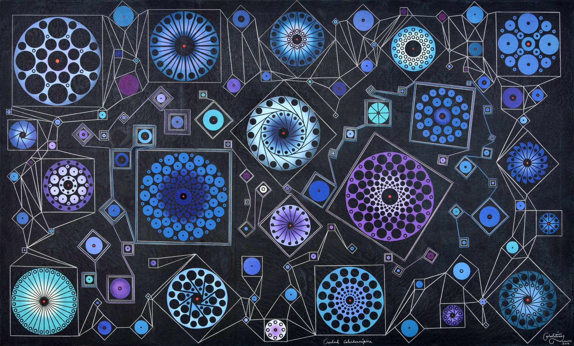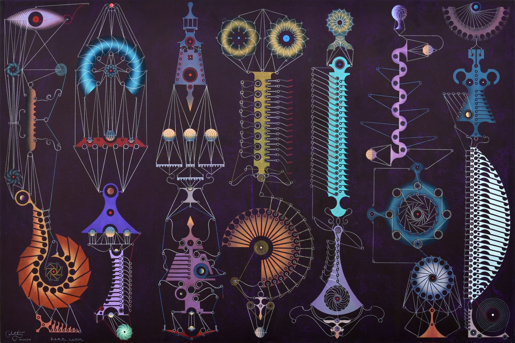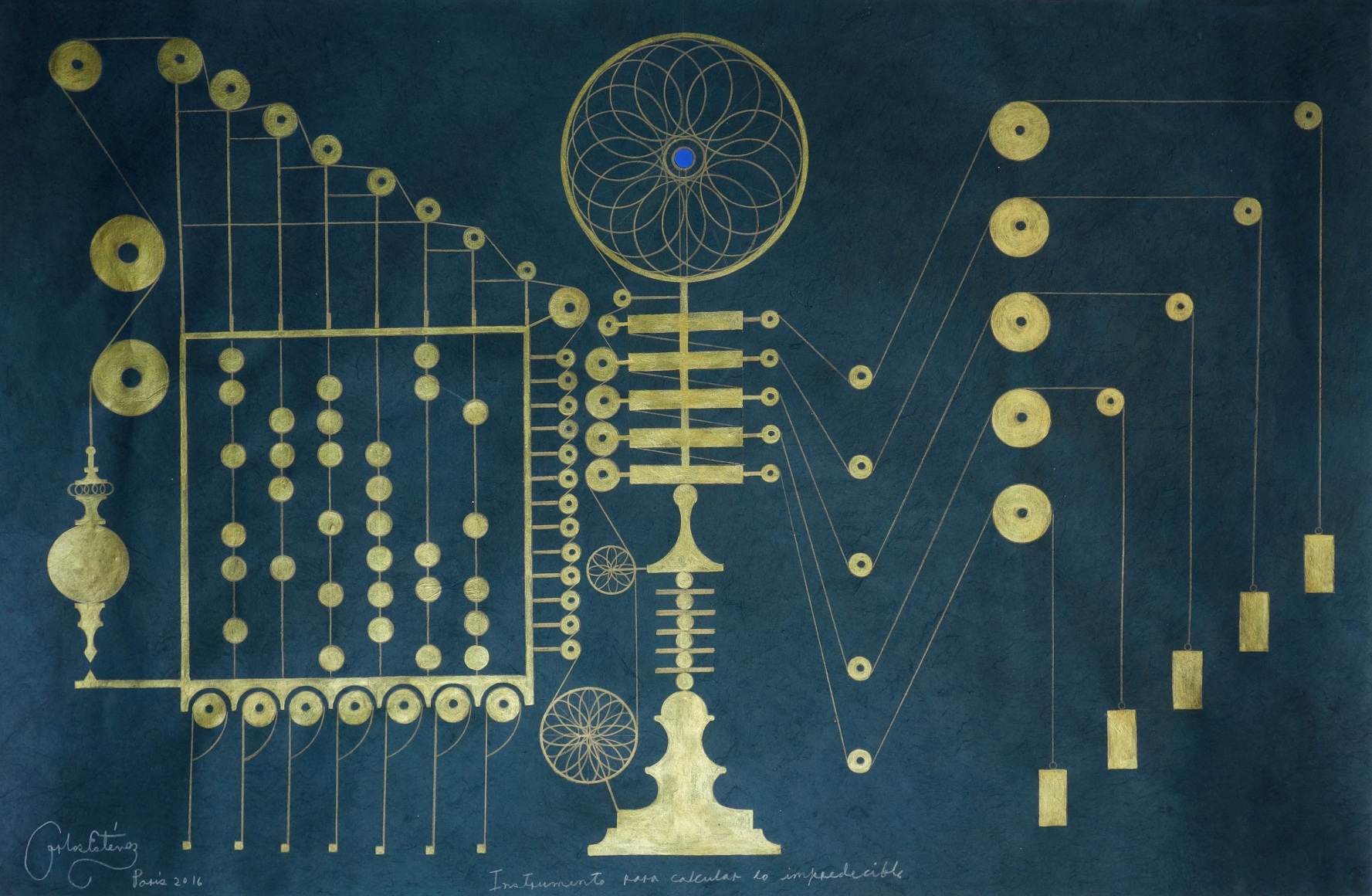 In these works, Estévez builds worlds, allegories for the tension between our microcosms of imagination and our macrocosms of existence, as we try to suspend ourselves between the two to maintain our sanity. He draws from experiences as varied as his compositions: a life started in Cuba, but with significant time in Paris, Charlotte, and in the last few decades, Miami. He bends these experiences through the conceptual lens of illuminated manuscripts, medieval texts, and contemporary philosophy, what Estévez has described as “transcriptions and translations of my everyday observations into images.”