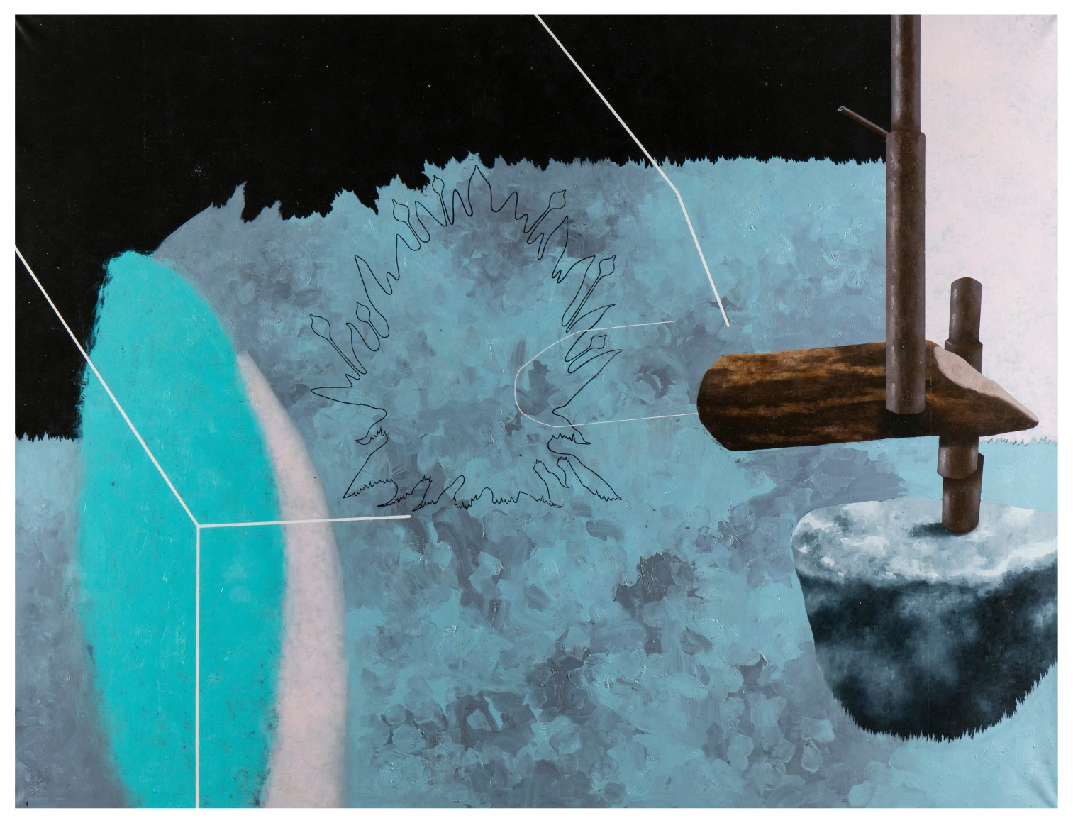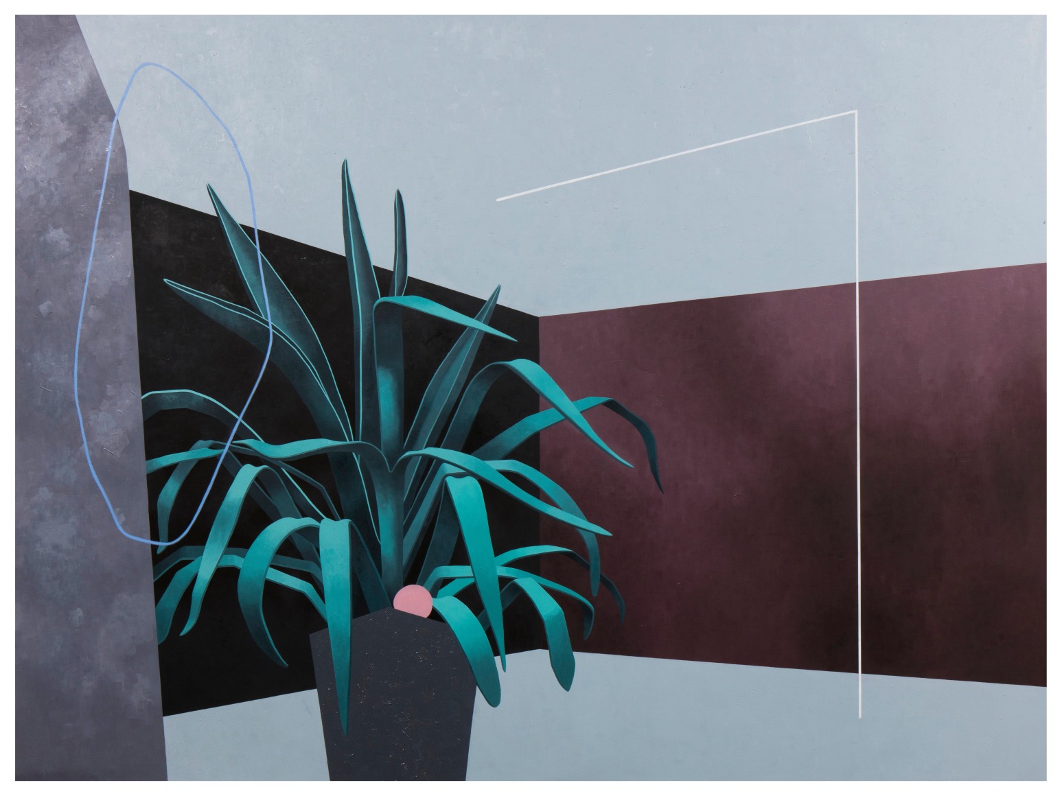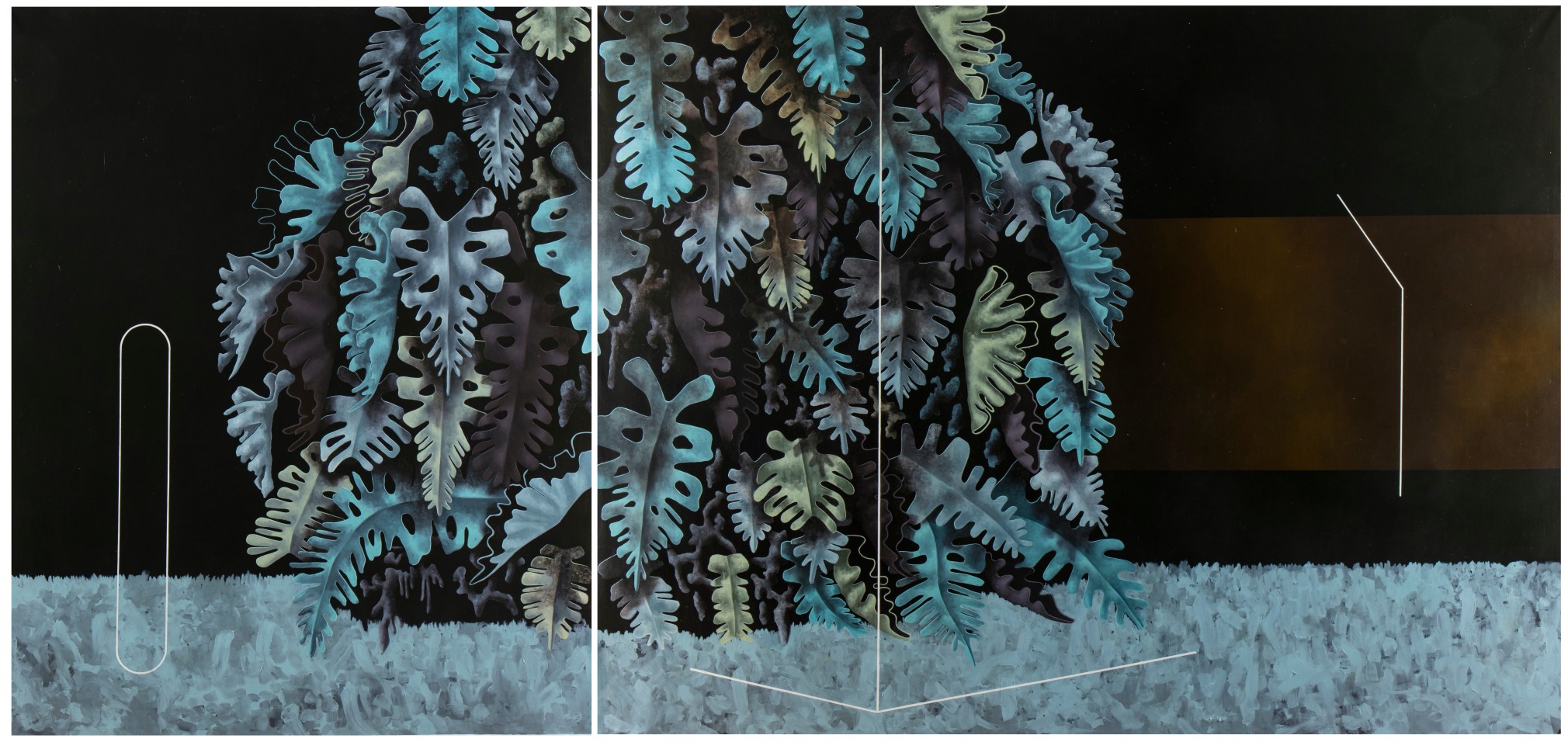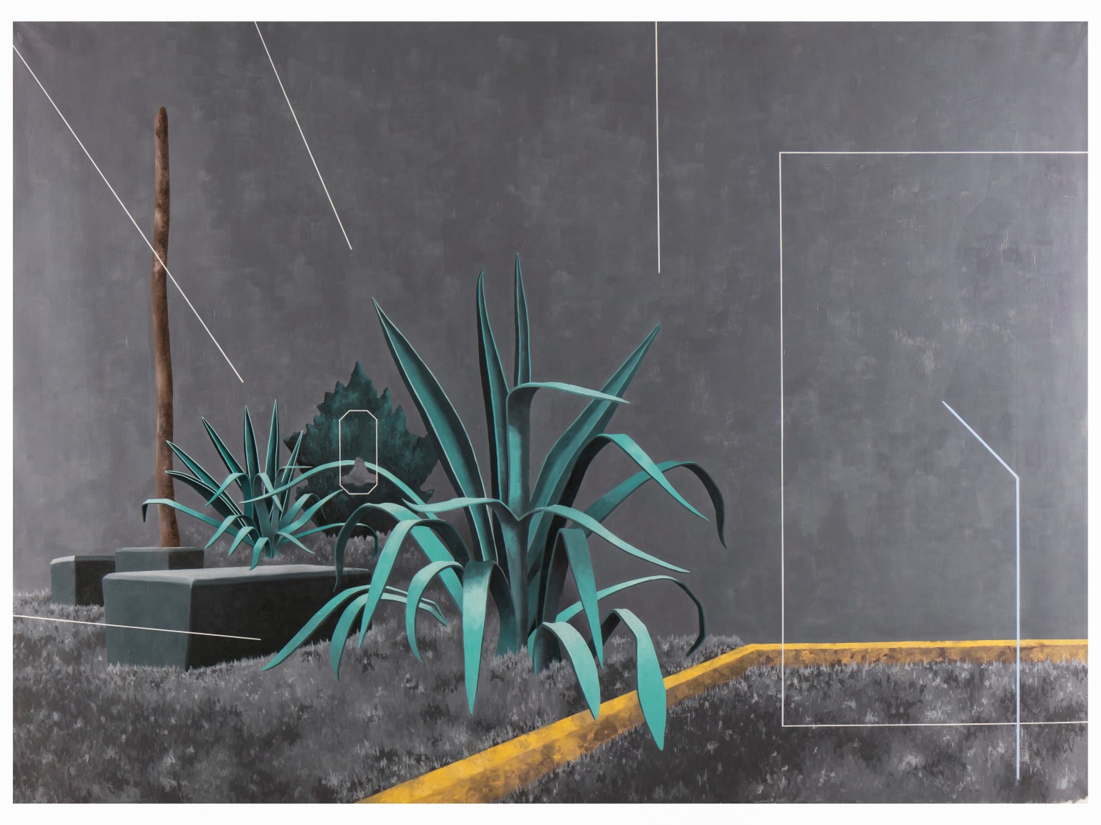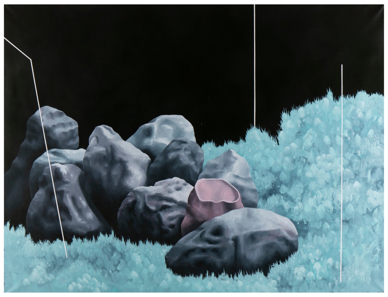 Juan Dolhare creates systems that abandon the inherent nature of objects, rendering them adrift and void of meaning. Evoking a marked calmness, Dolhare’s careful precision resembles the exactness of a computer-generated image, honoring fractal patterns found in the natural environment. The insertion of perfectly straight lines and objects resembling contemporary functionality not found in nature offer a dichotomous dialogue to depict a surrealistic, fossilized world —one that strikes an almost-eerie sense of peace and balance. Further, the organization of these objects in ambiguous environments lead to a questioning of their meaning and their status as a sacred material good.